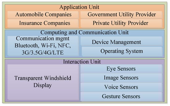 Figure 3 illustrates the system architecture of the smart car demonstration platform, focusing on its three major units namely, the interaction unit, computing and communication unit, and application unit. Through the application unit, an open platform is provided to the smart car for users to download applications from government/private utility providers or automobile companies in order to customize the vehicle’s performance, features and capabilities. In order to meet the requirements of the users in areas such as entertainment, communication and social, shopping, travel utilities, smart car-appropriate applications can be developed. In a smart car system, because of the usage of various battery powered devices such as sensors, display units, computing and communication devices, the energy consumption in terms of fuel, electricity, etc. can be increased. Therefore minimizing the energy consumption in smart car-enabled IoT applications will be a significant issue in the future.