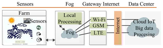 Water and electricity both are the most prominent input parameters in agricultural systems. In a situation of inadequate rainfall, crop production is restricted due to inefficient usage of water resources and irrigation scheduling. From this perspective, the Cloud of Things (CoT)-based smart irrigation system has been introduced to utilize water and energy in an effective and efficient way, while enhancing agricultural production []. The irrigation system becomes more efficient and less costly by smart water usage (supervising and monitoring water capacity, timing, location and duration of flow on the basis of data analytics). The combination of data analytics collection from the CoT (weather situation, type of soil, land condition, crop features, etc.) and data capture by sensors measuring moisture, heat, water stress, chemicals, etc., provide practical information. This information helps farmers utilize fertilizers, water and pesticides in appropriate locations and quantities.