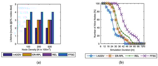 Considering a 2% dead nodes situation as a monitoring threshold, Figure 6a shows the network lifetime of various protocols (AODV, ER-RPL, REL and FFSC) under various node densities According to Figure 6a, network lifetime is defined as the number of rounds until 2% of the nodes die. In all simulation scenarios with 100, 200 and 500 nodes, FFSC outperforms other protocols, in terms of lifetime, then ER-RPL and REL have equal lifetimes, and AODV performs the worst. Figure 6b shows the percentage of alive nodes as the simulation time increases. Two measurement metrics were used to assess the energy efficiency: network lifetime and the saturation time of the IoT network.