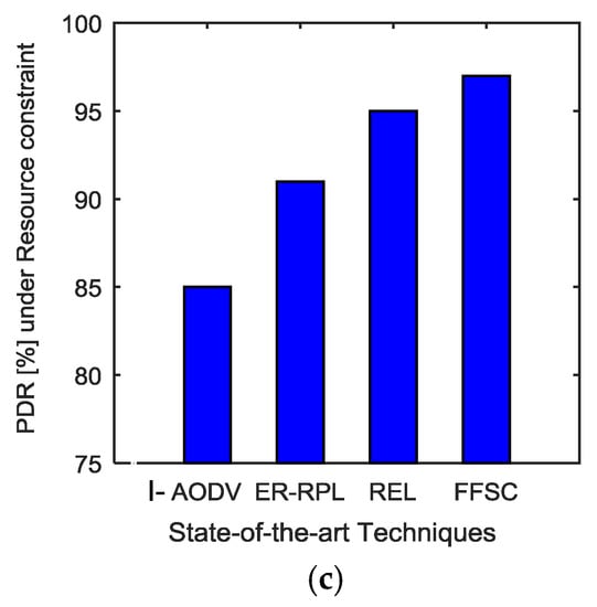 According to Figure 6b, the network lifetime is defined as the time spent by device nodes in the IoT network until the moment when only 1% of the nodes remain alive. The saturation time is like the network lifetime, except its measurement begins from the point when the first node dies. Saturation time values allow one to evaluate the ability of a routing algorithm to effectively adjust to another topology due to the death of nodes. In a 100 node density case, the saturation time of AODV is 33 min, which is less than the saturation time of FFSC (39 min), while ER-RPL and REL lay between AODV and FFSC. The network lifetime of FFSC is 69 min, which is 9, 15 and 24 min more than REL, ER-RPL and AODV, respectively. Therefore, in terms of network lifetime and saturation time, FFSC is the most suitable protocol, followed by REL, then ER-RPL, and AODV is the least suitable. The reliability of the existing routing protocols AODV, ER-RPL, REL and FFSC has been measured using packet delivery ratio (PDR) which is described as the ratio of the number of successfully transmitted packets to the total number of transmitted packets. Figure 6c illustrates the PDR in the simulated scenario with 100 nodes for all packet transmissions, while establishing an interval from 75% to 100%. As can be seen in Figure 6c, FFSC, which delivers 97% packets successfully outperforms AODV (85%), ER-RPL (91%) and REL (95%), respectively and AODV delivers the least packets successfully.