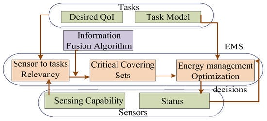 Toward QoI and Energy-Efficiency in Internet-of-Things Sensory Environments (TQEE) [] has been proposed to manage long term energy consumption under appropriate QoI constraints in diverse applications like environmental monitoring, etc. In this technique, first a novel approach of QoI-aware sensor-to-task relevancy is introduced considering the sensing capabilities of sensors. Then, after proposing the technique of critical coverage set of a given task to select the sensors, dynamic decisions for energy consumption optimization are made instantly (Figure 8).