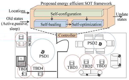 An energy-efficient next generation network management (SOT-EENGNM) [] has been proposed to minimize the total energy consumption of things and to stabilize the whole coverage area by using an optimization procedure. In this technique, the next generation self-configuration, self-healing and self-optimization procedure of self-organizing network structure of long term evaluation systems is redefined to overcome human dependency in SOT (Figure 9).