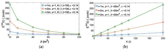 Representation of Equation (5): (a) total energy utilization via actual coverage area; (b) total energy utilization via number of active sensor nodes.