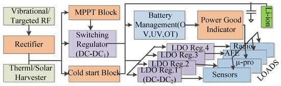 Efficient Solar Power Management System for Self-Powered IoT Node (ESPMS) [] is an architecture which achieves higher end-to-end energy efficiency while avoiding linear regulator and presenting a power convertor based on on-chip switched capacitor in IoT system. In the proposed architecture (Figure 11), there are two stages: DC-DC1 and DC-DC2 for DC-DC converters between harvesters and loads.