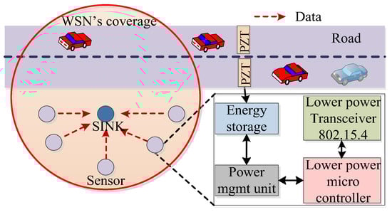 where is energy consumed to operate electrical circuit in the sensor node, , , and are electrical current used in transmission, receiving, listening and sleeping mode, respectively. Figure 12 illustrates EHWSN architecture for moving vehicles.