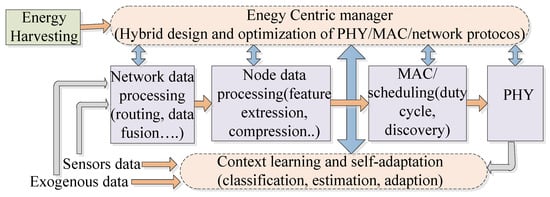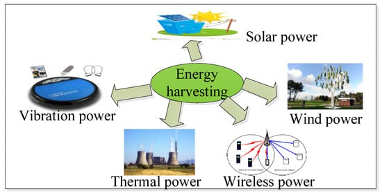In the form of light, temperature, motion, wind, electric, sound, mechanical etc., but only needs to be harvested. Cyber-physical systems, which are a new area in IoT, combine networking and computing with physical processes []. These processes can be human controlled or autonomous. IoT-based smart sensors gather, control and measure the information and communicate to the base station []. Because of the battery limitations of the devices, energy harvesting is necessary, using natural energy resources like wind, vibration power, solar and thermal power []. Due to unreachability of these devices in many cases, energy efficiency to support these devices through energy harvesting techniques is an important research issue. In Figure 22, various natural energy resources those can be potentially utilized for energy harvesting are illustrated. The usage of energy resources such as solar power, vibration power, thermal power, wireless power and wind power may solve the issue of battery limitation in terms of energy through various energy harvesting techniques, in the IoT environment [].