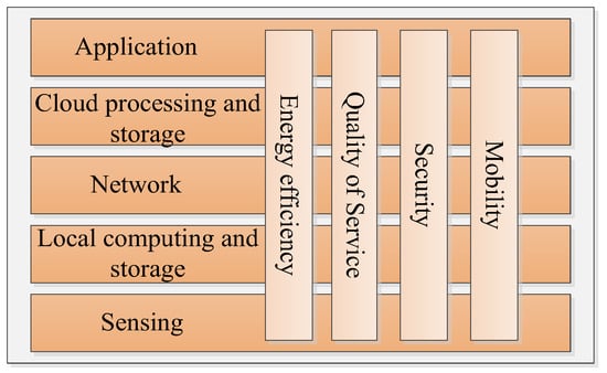 Several algorithms and techniques working separately on a particular layer of IoT architecture are introduced for energy efficiency in the IoT. Combining them in single operational solution is an existing challenge. The concept of interoperability should be stabilized and privileged by the system to avoid oscillation among layers []. Moreover, there should be enough flexibility in the system, while changing a certain techniques such as energy efficiency of a particular layer without affecting the whole IoT system. Figure 21 represents the concept of interoperability of IoT layers: sensing, local processing and storage, network, cloud processing and storage, and application, in terms of various techniques related to energy efficiency, mobility, and security and QoS parameters. This cross layer interoperability makes a IoT system more effective and efficient in various IoT applications [,,,,,,,].