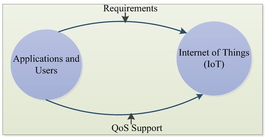 Devices have become autonomous and intelligent, because of the usage of new computational concepts like artificial intelligence for the effective deployment of IoT networks []. The limitations of energy consumption should be adapted through the association of artificial neural networks. Moreover the QoS constrained system may be controlled in an intelligent manner for every IoT application that may have a distinct energy profile []. According to the requirements of every application in an IoT network, novel techniques and research based on QoS constraints can contribute to providing potential solutions []. Figure 24 represents a QoS-constrained IoT system, while fulfilling various requirements such as artificial intelligence, to solve the open challenge of energy consumption in IoT applications.