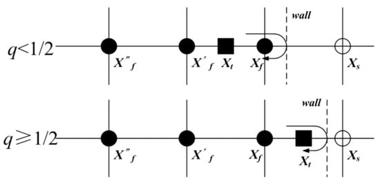 For a moving wall treatment, a certain amount of momentum transfer between fluid and solid surfaces must be considered. Lallemand [] applied Bouzidi’s model to treat the problem. So to reflect the fluid–solid interaction (i.e., the momentum transfer) at the boundary surface (), one additional term need be added to the distribution function. , the additional term, is given by: