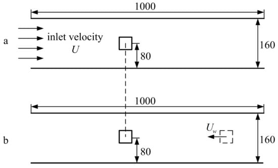 In order to validate the feasibility of Bouzidi’s interpolation-based model in dealing with a moving boundary, the verification simulations considering two cases of channel flow (i.e., a stationary square cylinder positioned in the channel and a square cylinder moving in the channel) are performed. As shown in Figure 3, a 1000 × 160 lattice structure is chosen for computation, and the square cylinder on the axis of the channel is assumed to have a side length of 20 lattice units (this article will always use lattice units). In this model, each lattice spacing corresponds to 1 mm, and each time step corresponds to 0.165 s. At the upper and lower walls, a no-slip boundary condition is imposed. In Figure 3a, square cylinder is stationary and inlet velocity , and in Figure 3b, square cylinder velocity and inlet velocity .