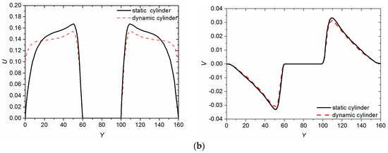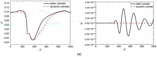 The numerical results of the moving boundary treatment in the two cases are compared in Figure 4, which show the distribution of the X-direction velocity component (U) on longitudinal section and the Y-direction velocity component (V) on cross section containing the center of the square cylinder. To make the comparison results more clearly and comparable, instead of the actual velocity, the relative velocity of the fluid, relative to the square, is used to denote the flow of the fluid. In Figure 3, it is obvious that the numerical results of both U and V are in excellent agreement except for the results of V on the longitudinal section. In addition, the order of magnitude of V on longitudinal section is so small (i.e., 10−13) that the slight volatility will make no difference. It can be concluded that, although physical models of the two cases are different, the numerical results of the two direction velocities on both sections are consistent, respectively.