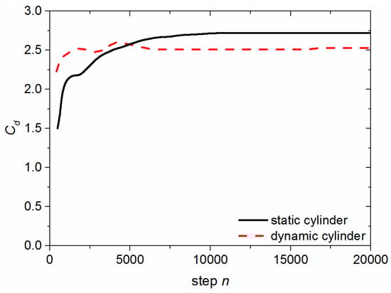 The lift coefficient is constant equal to 0, for the square cylinder at the middle of the channel throughout the entire simulation. The comparison result of the drag coefficient is shown in Figure 5. In general, the results of the two cases show a good agreement.