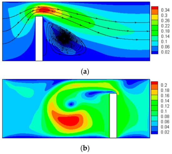The distribution of velocity with a pin fin. (a) Static pin fin, (b) Moving pin fin.