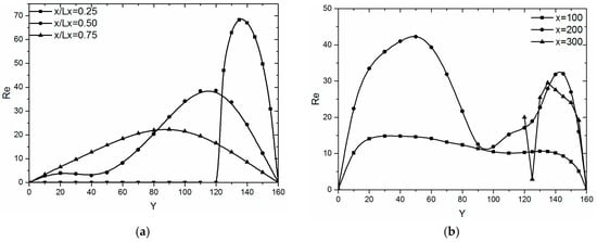 Re varies with Y-axis on different sections. (a) Static pin fin (x/Lx = 0.25); (b) Moving pin fin (x/Lx = 0.75).