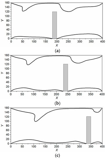 In this section, the effect of square cylinder moving from left to right along the lower wall is studied. As shown in Figure 8 below, the computational domain is mapped using a 400 × 160 mesh, the height of the square cylinder is 0.75D (D is the channel diameter). The inlet velocity of the fluid U and square cylinder’s movement velocity are fixed at 0.05 and 0.1. Figure 8 shows the reconstruction of the boundary layer of the fluid in the process of a square cylinder moving from left to right along the channel. It is clear that as the square cylinder comes close and goes away, the boundary layer is destroyed, and then returns to its previous state, respectively. The boundary layer of the front and rear of the cylinder become obviously thinner through the movement.