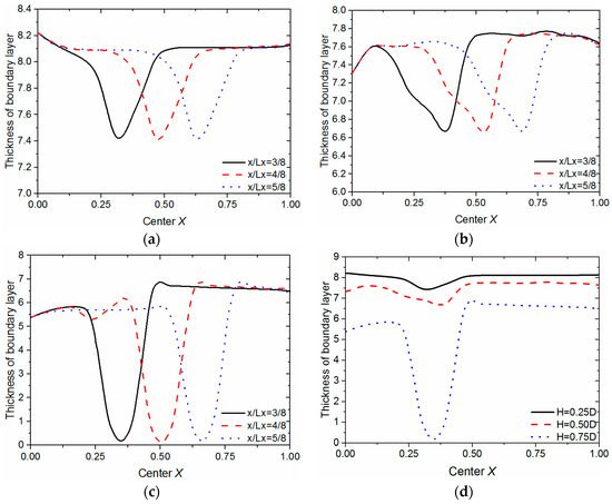 In order to explore the effect of different height of the moving cylinder on the flow field, the height of the square cylinder is varied from 0.25D to 0.75D in increments of 0.25D. In Figure 9, X-direction indicates the ratio between the distance (x) from the inlet of the channel and the length of that, and Y-direction indicates thickness of the boundary layer. Figure 9a–c shows, as the square cylinder with different heights H (0.25D, 0.5D, 0.75D) moves to different locations (x/Lx = 3/8, 4/8, 5/8), the thickness of the boundary layer along the channel varies with that. It is obvious that the boundary layer in the location where the square cylinder moves to is the thinnest, and with the square cylinder going away, the boundary layer becomes gradually thicker until it returns to the original state it was. In Figure 9d, the results of that three square cylinders with different height move to the same location (x/Lx = 3/8) are compared. The conclusion can be drawn that the thickness of the boundary layer decreases with the square cylinder’s height increasing.