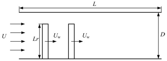 From the above simulation, the boundary layer will be reconstructed after the cylinder passes by. So another cylinder is added to destroy the boundary layer again, which can both lengthen the domain with thinner boundary layer and strengthen the mixture and disturbance of the flow to enhance the heat transfer further. As shown in Figure 10, the computational domain is mapped using a 1000 × 160 mesh, the side length of the cylinders is 20, the height of both cylinders is 0.75D. As well, the velocity of the liquid in the channel is . Two cylinders with a certain distance move at the same velocity of to destroy the boundary layer.