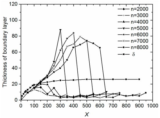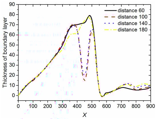 The distance of the double cylinders has an obvious effect on the thickness of boundary layer. In some cases, it did not reduce the thickness of boundary layer effectively. Therefore, the optimized distance of the double cylinders is needed for design by simulation. The thickness curves of boundary layer with the different interval distance of the double cylinders at the same time and the same Re number are shown in Figure 12. At the domain from 400 to 500 in the X coordinate, the thickness of the boundary layer may has crests or troughs with different value of interval distance of the double cylinders. There is an optimal interval distance in the domain of 60~180. The effect of the interval distance is obvious from 400 to 500 in the X coordinate. The Figure 13 shows the thickness of the boundary layer with different interval distance of the double cylinders at x = 450. Thus, the optimal interval distance of the double cylinders is between 90 and 140.