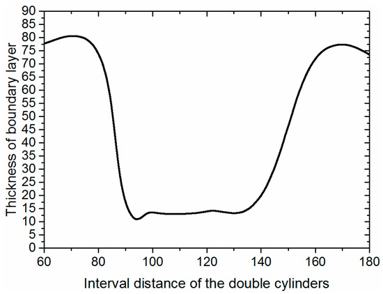The thickness of the boundary layer with different interval distance of the double cylinders at x = 450 in Figure 10.
