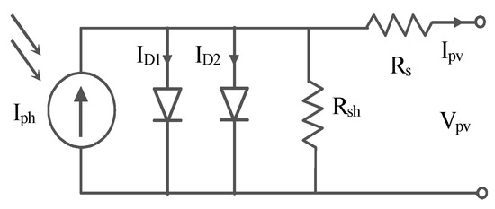 Figure 2 shows a double-diode solar cell model. It is represented by a current source in parallel with a diode and a parallel resistor, as well as a series connected resistor at the output terminal.