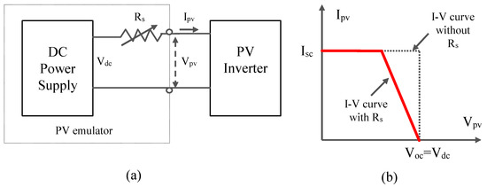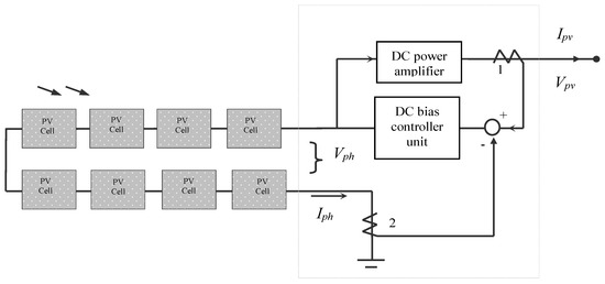 To emulate a PV panel/array it is essential to have the measured electrical characteristics from the datasheet (such as their I-V curves and temperature effects), which can be prestored in look-up table of the control system of the PV simulator system with reference to [5,30,31,32] or calculated in real time by using the I-V Equation (1) as discussed in [23,33,34,35]. The circuit connection for the PV simulator can be seen in Figure 8.