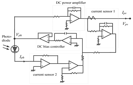 Research in [9,10] present a solar simulator implemented by amplifying the small current and voltage of a photo-diode using an analog technique. The block diagram of the main experiment circuit is shown in Figure 4.