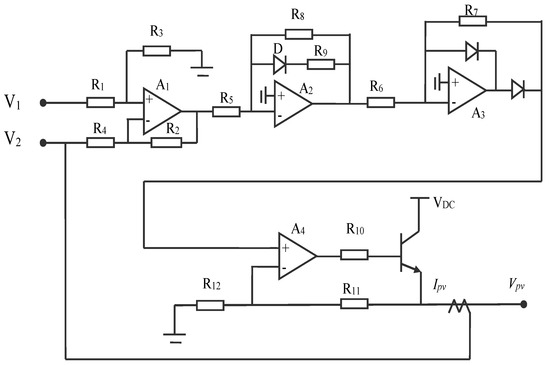 Based on Equation (6), an interested low-cost solar PV simulator was implemented in [13] by using discrete operational amplifiers as shown in Figure 6, where voltage V1 and V2, are the input voltage of the differential amplifier A1. These are assumed to be proportional to the photo-current and output current of the PV simulator respectively. Resistances R1 to R12 are the main parameters of the PV simulator and need to be set carefully. A3 operated as an inverting half-wave rectifier with unity gain which inverts the negative input signal to the amplifier A4, to compensate for the difference between the diode D thermal voltage and the solar cell thermal voltage as well as amplifying the output. It is a good low-cost solution for implementing PV simulators, however the only disadvantage is that the effect of the series resistance is not considered. When compared against the experimental results for the 12 W thin film solar cell, there are 5.4% error for the actual maximum output power and 3.4% error for the open circuit voltage.