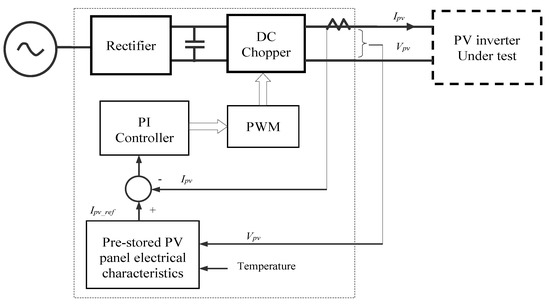 Analog technique based PV simulator has the advantage of high bandwidth and it can provide fast response for testing high frequency MPPT algorithms [9,10,11,12,13]. However, this type of PV simulator suffers the disadvantages of low efficiency and large physical size as well as higher manufacturing cost. To overcome the disadvantages of analog technique based PV simulator, switching mode electronic circuits based PV simulators were proposed [14]. Figure 7 shows a general block diagram of switching mode circuit based PV simulator. There are three main parts: the rectifier circuit for supplying dc voltage to the chopper circuit, the switching mode chopper circuit and the feedback control circuits. The dc chopper generates the emulated electrical characteristics of the PV panel/arrays to be emulated. The basic principle of operation is that when the PV simulator is used for testing PV inverters, the terminal voltage is regulated continuously by the connected PV inverter. is also an input signal for the pre-stored PV panel electrical characteristic to find the corresponding reference current of their I-V curves. The chopper circuit current controller controls the output current to track the reference current .