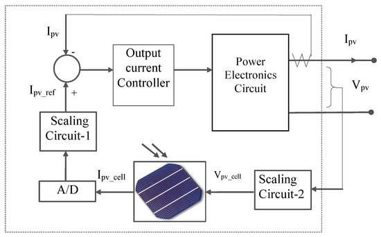 To overcome the above-mentioned drawbacks of the look-up table and the equation based techniques, an actual solar cell based PV simulator was presented in [22], where, the reference current signal of current controller was generated by a solar cell in real-time by supplying a scaled voltage to the solar cell. The block diagram is shown in Figure 10.
