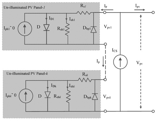 Equivalent circuit of the constructed PV source with multiple un-illuminated solar panels connected in series.