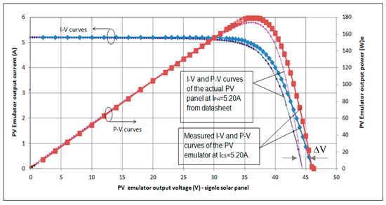 Figure 15 shows the electrical characteristic comparison of the constructed PV source with an excitement current (corresponding to 1000 W/m2 at 25 °C STC). There is a small shift for the I-V and P-V curves between the constructed PV source and the actual solar panel when compared (see the datasheet given in [36]). The shift point starts after the point of (, ), before the maximum power point (MPP), at which the emulated PV source output current starts reducing rapidly. From Equation (9) the current injected into the solar panel increases with the drop of the output current from the emulated PV source. The difference is approximately determined by the product of the solar panel’s series resistance and the current injected into the solar panel from the external current source, i.e., as shown in Figure 11.