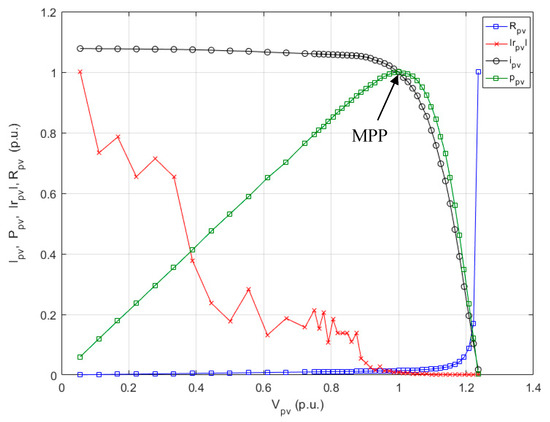 In Figure 16 and Figure 17 all the curves are presented in per unit, respectively. The base value of the current and voltage are the corresponding current and voltage at the maximum power point (MPP) at irradiance of 600 W/m2, i.e., and respectively. Ipv-p.u. = Ipv/Ipv_base, Vpv-p.u. = Vpv/Vpv_base. The per-unit dynamic and static resistance values were drawn based on their maximum values, i.e., 1.8 kΩ for dynamic resistance, and 950 Ω for static resistance, respectively. Please note that the actual dynamic resistance appeared as negative values across the range of all the operating conditions, for the simplicity of the results presentation, the dynamic resistance values shown in Figure 16 and Figure 17 are their absolute values.