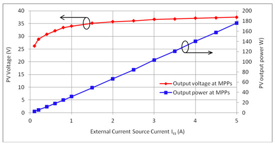 The output power and operational voltage measured at the maximum power point (MPP) versus excitement current , are presented in Figure 18. A linear interpolation method was used to determine the MPP values (power and voltage) for the values between two adjacent measured points. The relationship between excitement current , and the power at MPP is shown in Figure 18. One can see that the maximum output power value is proportional to the excitement current (increase in this current corresponds to the increase of the sun irradiance in the outdoor environment). The open-circuit voltage is also affected by the and it saturates at higher values of . This variation confirms that MPPT algorithms are essential to control PV inverters to guaranty that a PV source always operates at its maximum power point for any solar irradiance conditions.