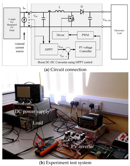(a) circuit connection (b) experiment test set-up of the constructed PV source interfaced with power electronics converter and load.