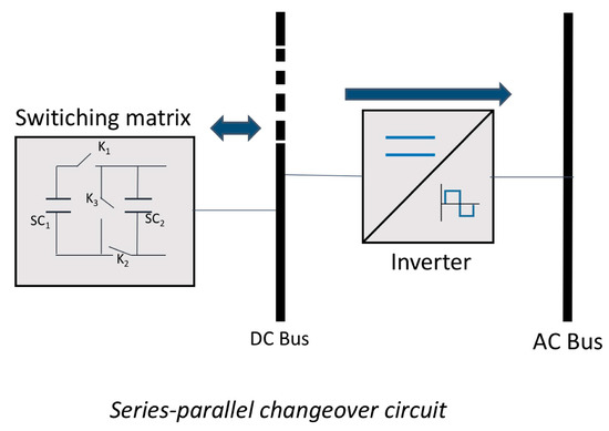 The switching matrix improves the extraction of average energy in an SC bank and increases the reliability of the DPGSs; however, for the interconnection with the DC bus, the incorporation of a unidirectional DC/DC converter that reduces the voltage variations during the SCs’ discharging process could be necessary. Since the initial objective was to avoid the doubled energy processing of the bidirectional DC/DC converter, the switching matrix avoids the need for processing during the SC bank charging process, increasing the overall efficiency of the system with this action. In practice, the energy losses are significantly reduced by the appropriate selection of charging and discharging cycles, and by the relative sizes of the capacitors involved. If the replenishment and transfer of charge occur repetitively, the energy loss can be is least; however, this action must not be done at too high a rate, because the high switching rates serve only to degrade the efficiency of the process.