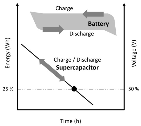 A series/parallel changeover circuit (Figure 2) was proposed as a simple option [10,11,12]. The connection between the SCs of an SCB depends on the properties and requirements of the system in which it is used. Series connection increases the voltage level and provides a power supply suitable to more robust applications with major electrical power requirements [10]. Nevertheless, due to the non-uniform properties of all series/connected cells, it causes a small imbalance in the continual charge and discharge process due to the various voltages present in every cell [13]. A parallel connection is typically used in applications that a require high current for operation; this connection increases the storage capacity by adding to the total ampere-hours (Ah) and controlling the voltage range [14]. One factor to consider in the connection between the SCs of the bank is the fact that the voltage in the power terminals of the bank varies according to the stored energy. Extraction of energy in an SC is more demanding than in the case of batteries; when they have supplied nearly 100% of their energy, their voltage decreases to only 80%; whereas when the SCs have delivered only 75% of their energy, their voltage drops to 50%. Under these conditions, the banks fail to meet the requirements demanded by loads that require a minimum voltage to operate correctly; that 25% remains as available energy, thereby limiting the occurrence of its deep charge/discharge cycle (Figure 3) [15]. In the case of using SCs for energy storage, efficient power conversion electronics are required, with which the SCs can be discharged as efficiently and deeply as possible (i.e., a high average energy extraction of SCs [16]). The efficiency of SC modules is a parameter directly related to the energy extraction. The SC must be discharged as much as possible to obtain a higher extraction of the stored energy. The energy extraction of the SCs () is defined by the ratio of the initial energy () of the module, and the residual energy () [17]: