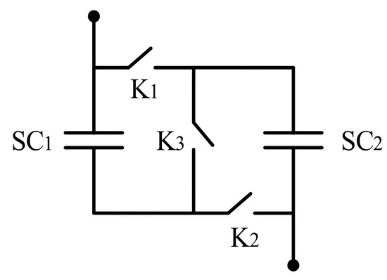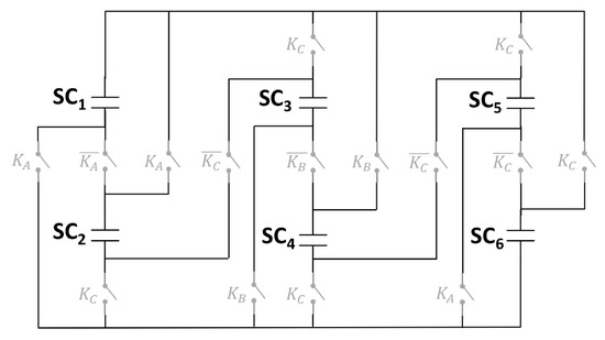 Since the voltage density and power of an SC is low, it usually requires a series/parallel system reconfiguration for the SCB. A basic switching cell BSC has previously been proposed, which allows the reconnection of the SC [28]. This system requires three control signals for each switching cell (Figure 4). Cells of two or more levels have been proposed for handling a large number of SCs with a variety of series/parallel configurations. However, the number of control signals increased, requiring up to five control signals for a bank of two levels [29]. In another work, a proposed three-level cell required 12 control signals [30]. In this study, the analysis of a storage bank with programmed discharge for the series/parallel changeover of six SCs () is presented. Figure 5 shows the connection circuit for the switching matrix. In this case, it was possible to obtain a simplified model for the matrix with three switching states () and its complement (). The series/parallel changeover was dependent on the output voltage level of the bank, and this feature connection could be extrapolated to larger arrays. The proposed reconfigurations were based on the number of devices to increase the energy delivery time of the storage bank to a constant voltage level within a set interval to ensure a uniform energy extraction from each SC with deep charge/discharge cycles. The electric circuits connecting the SCs in each reconfiguration and programmed state of the storage device are shown in Table 1.