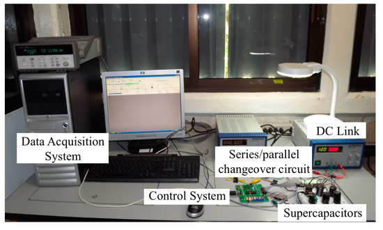 The electrical characterization was undertaken with data acquired from the charge/discharge test, which were performed with six SC IC107DCN2R7Q (100 F − 2.7 V); a resistor at 4.7 Ω was used to limit the charge current of the SCs. The discharge was performed using a resistance of 3.7 Ω. The voltage supply of the SCs was 1.0 V, and the switching circuit was 12.0 V, which was powered by the DC GW power supplies Instek GPS-3303. The energy values reported were calculated by reading the bank voltage and SC voltage with a Agilent 34970A data acquisition unit. LabVIEW was used as the data measurement and recording platform; Figure 8 shows the test bank.