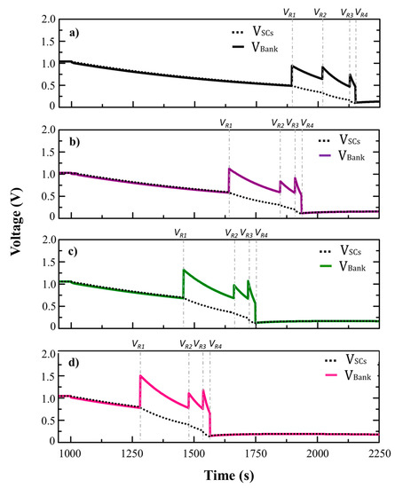 Figure 9 shows the discharge of the SCB for each discharge routine obtained from the electrical characterization and the average value of energy present in each device, as well as presenting the complete bank during each of the reconfigurations. The reconfiguration of the bank voltage (), as well as the period between each reconfiguration, can be observed. The increase in the voltage peaks corroborated the execution of each of the proposed reconfigurations. The average voltage level () present in the six SCs at the time of each reconfiguration is displayed by the dashed line. Each of the proposed reconfigurations increased the voltage delivery time within the functional range to meet the requirements demanded by loads that require a minimum voltage to operate correctly. It can be seen from Figure 9 that the higher the voltage value of the reconfiguration, the greater the level of tension obtained in the output of the SCB. The slope of each discharge process is different, because the reconfiguration voltage value in each respective routine is not equal, while the higher the reconfiguration voltage limit, the longer the percentage time increment, and due to this, the original discharge time is shorter, and therefore represents the most significant increase of time. The choice of an appropriate reconfiguration routine is dependent on the application and its voltage requirements. In all cases, however, the reconfiguration increased the energy delivery time of the storage device.