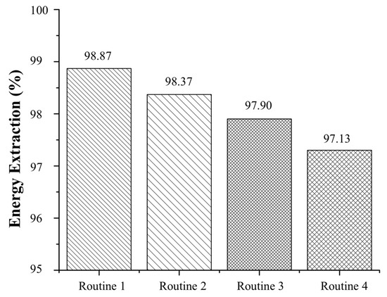 Despite its low energy density, the reconfiguration routines guarantee greater extraction of the energy available in the SC. With the proposed reconfiguration routines, up to 23% more energy was extracted per cycle. This increase in the extraction of the total available energy was equivalent to 30% more energy used during useful life compared to a device that was not reconfigured. The SCs were discharged to approximately 0.13 V, which is what determines the energy utilization ratio calculated by (1). Figure 10 shows the average values of the energy extracted from each routine, where high average values of extraction energy were obtained. The average energy extraction varied between 97.13% and 98.87%; 18% higher than the 83.3% and 83.1% reported by references [10,17], respectively. This result represents an equitable and efficient use of the energy of each SC, with deeper cycles of charge/discharge on each device.