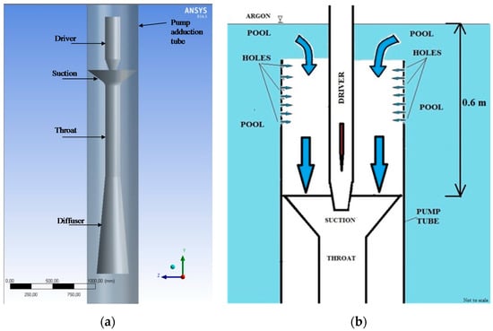 Using the hydrodynamic similarity and imposing the thermo-mechanical properties for lead [] in the theoretical correlations [], a first-guess geometry for the lead jet pump (Figure 4a) and for the flow patterns (Figure 4b) have been obtained.