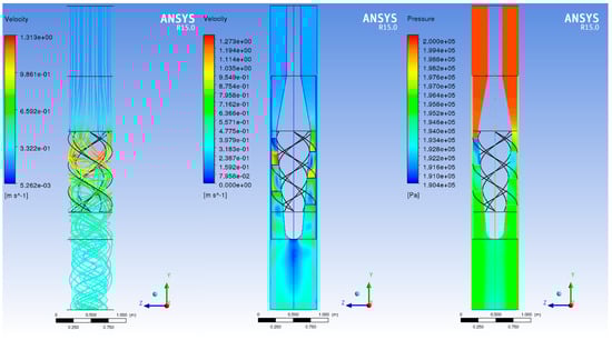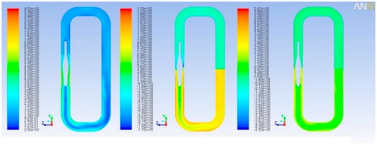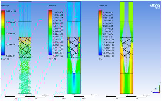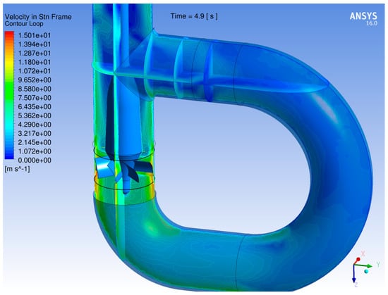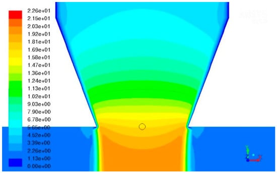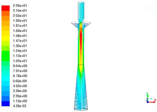 The velocity (magnitude) vectors and the contour plot of the velocity (magnitude) in the mid-plane section of the jet pump are shown in Figure 5 and Figure 6, respectively.