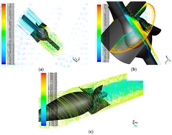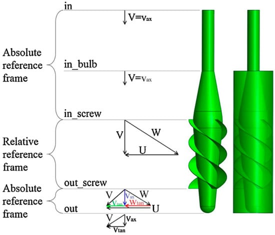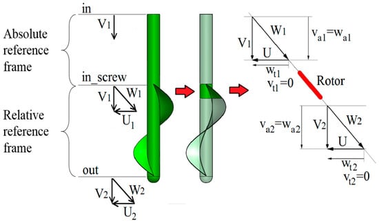 Figure 7 shows that, from the kinematic point of view, the traditional Archimedean pump with straight cylindrical beam can be considered as an axial pump with straight blades. From a theoretical analysis it can be demonstrated that, this pump cannot generate work because the velocity triangles in the sections in screw and out are not different. Indeed, in the non-viscous case and according to the canonical equation [], if the velocity triangle does not change between the inlet and outlet sections the (total and static) pressure remains unchanged. So, in order to generate the required increase of pressure, the pumping device has to deflect the flow field at outlet (i.e., the velocity triangle at the out section) with respect to the inlet conditions (i.e., the velocity triangle at the in section).