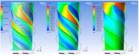 - By changing the axial pitch of the screw (Figure 8). In this case, the relative velocity W is reduced inside the device and hence, on the basis of the canonical equation [], the static pressure increases moving from the inlet to the outlet pump sections.