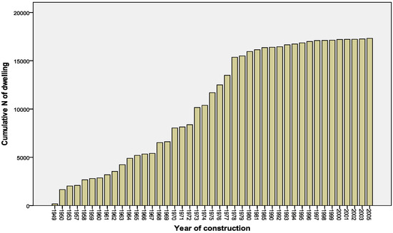 The social housing stock is managed by Lille Metropole Habitat (LMH). It is composed of 353 collective residences that contain 29,778 dwellings. Figure 1 shows the history of the construction of this stock. The major part of this stick was built before 1978, particularly in years 1950, 1968, 1970, 1973, 1975, 1976, 1977, and 1978. About 52% of this stock uses collective heating, while 40% uses individual heating, and only 8% uses a mixed heating system. The analysis presented in this paper concerned 84 residences (13,179 dwellings) that use collective heating.