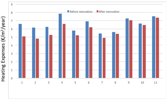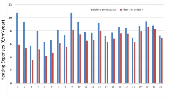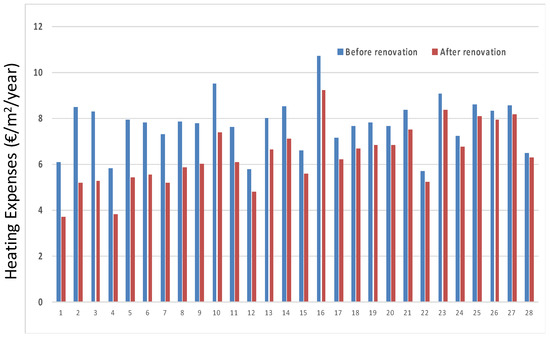 Figure 4 displays the results obtained for the renovation of Category D buildings (low energy performances). It shows that, for some buildings, the renovation reduces heating expenses by about 40%; while for others it reduces heating expenses by only 3%. The average reduction in heating expenses is equal to 17%, which is lower than that obtained for buildings in Category E (20%).