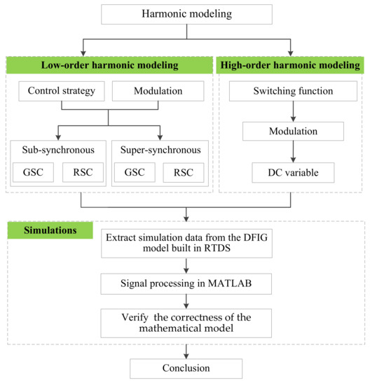 The difficulty of the harmonics analysis in a converter is that the power flow directions and the control strategies of grid side converter (GSC) and rotor side converter (RSC) are very different [16], which have an important impact on the generation of harmonics. There are many studies on the control strategy of the converter. The most commonly used control method is vector control (VC) [17,18,19], which has some advantages, such as precise steady-state performance, less power ripple, and lower converter switching frequency. In this paper, the harmonic modeling will be carried out under the VC, and the modeling will take into account the differences of power flow and specific control strategy in GSC and RSC. The proposed harmonic modeling proposed in this paper consists of two parts, the low-order harmonic modeling and the high-order harmonic modeling. These two models can be derived by their influence factors. The low-order harmonic component is affected by the control strategy and circuit topology, and the high-order harmonic component is affected by the modulation of the dc variable by the switching function [20,21,22], so the order of high harmonics will occur near the frequency modulation ratio, and the boundaries of high-order and low-order harmonics should be defined below the frequency modulation ratio. The frequency modulation ratio in this article is set to be 40, so it can be defined that the order of high harmonic is greater than 30, and the order of low harmonic is from 2 to 30. A complete and detailed harmonic modeling can be established through the above derivation method. From this modeling, the influence of the control method on the harmonic generation mechanism can be clearly shown, and we can conduct follow-up research based on this modeling.
