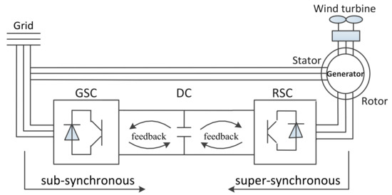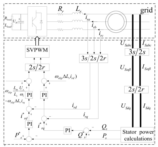 When the motor is running in super-synchronous state, the RSC operates as a rectifier and the energy will be sent from the rotor to the grid. The control strategy of RSC used in this paper is the double closed loop control that includes current inner loop and power outer loop [23], as shown in Figure 5.