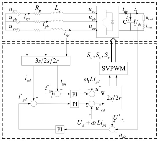 The voltage outer loop is designed to make the dc link voltage udc and the d axis current component igd constant, and the current inner loop is designed to modulate the grid power factor.