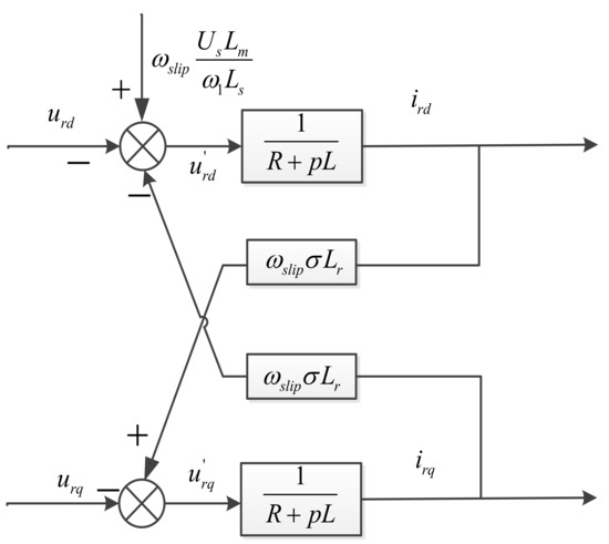 Where ird and irq mean the dq axis rotor currents. Ls, Lr and Lm are the stator leakage, rotor leakage and magnetizing inductance. Us is the stator voltage. Ps and Qs are the active and reactive power, and ωslip = ω1 − ωr. The control is designed to make the rotor speed constant by adjusting the rotor currents, and then the output power can be kept stable. As shown in Figure 5, the input currents of RSC can be obtained as: